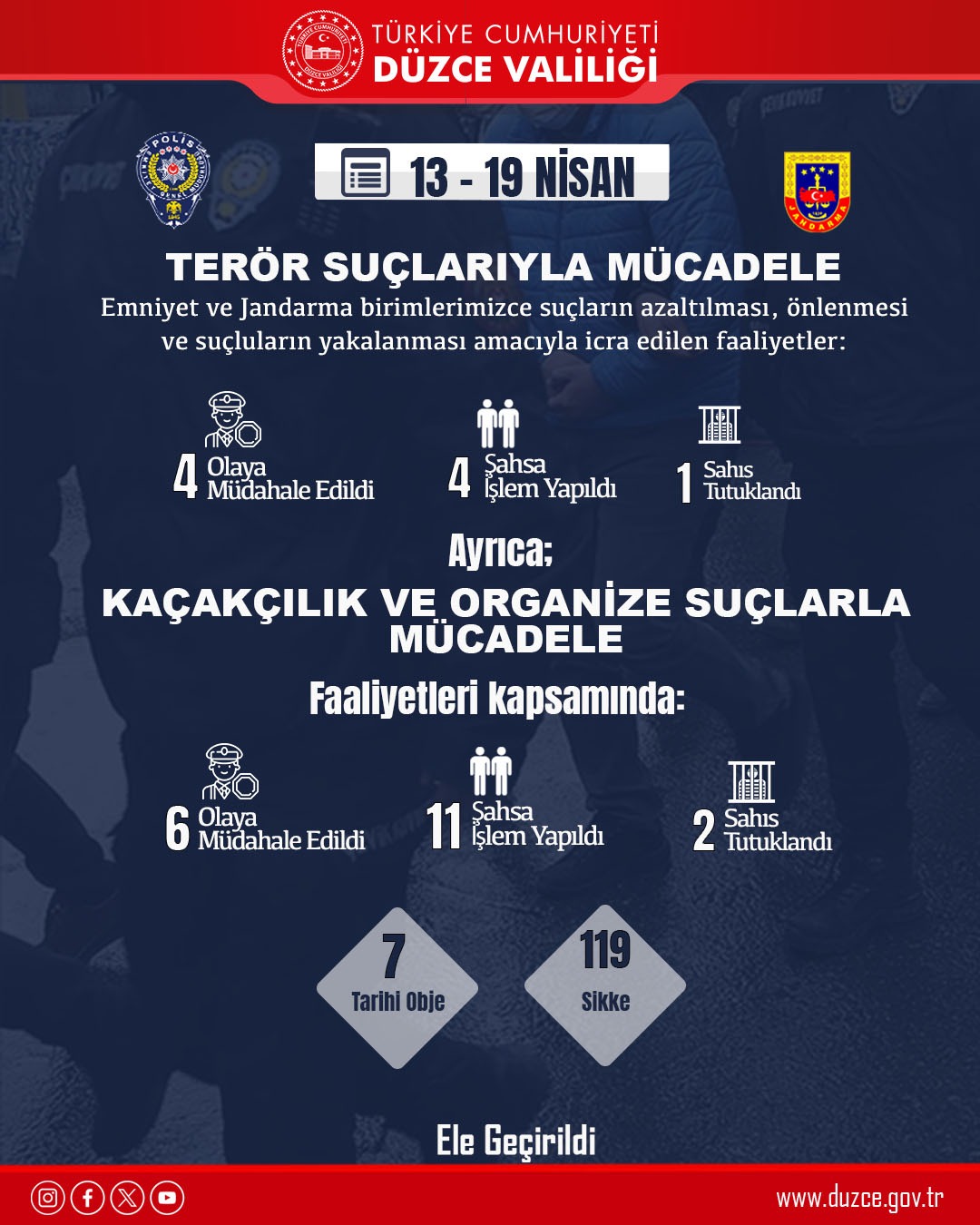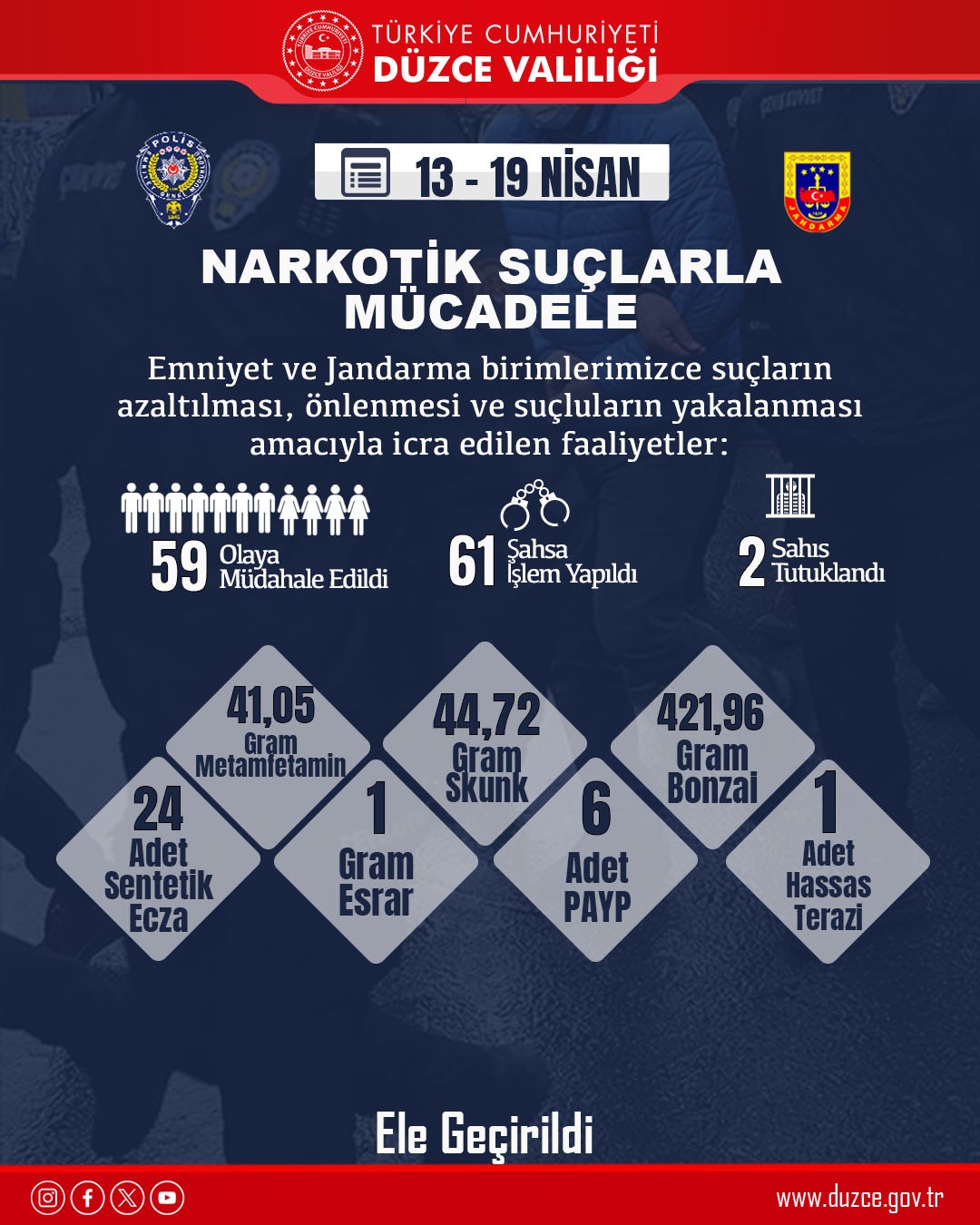 Düzce Valiliği, il genelinde emniyet ve jandarma birimleri tarafından 13-19 Nisan tarihleri arasında icra edilen asayiş, trafik, narkotik, terör ve kaçakçılıkla mücadele faaliyetlerine ilişkin verileri paylaştı. Suçların azaltılması, önlenmesi ve suçluların yakalanması amacıyla yürütülen çalışmalarda çok sayıda şahıs hakkında yasal işlem yapıldı.